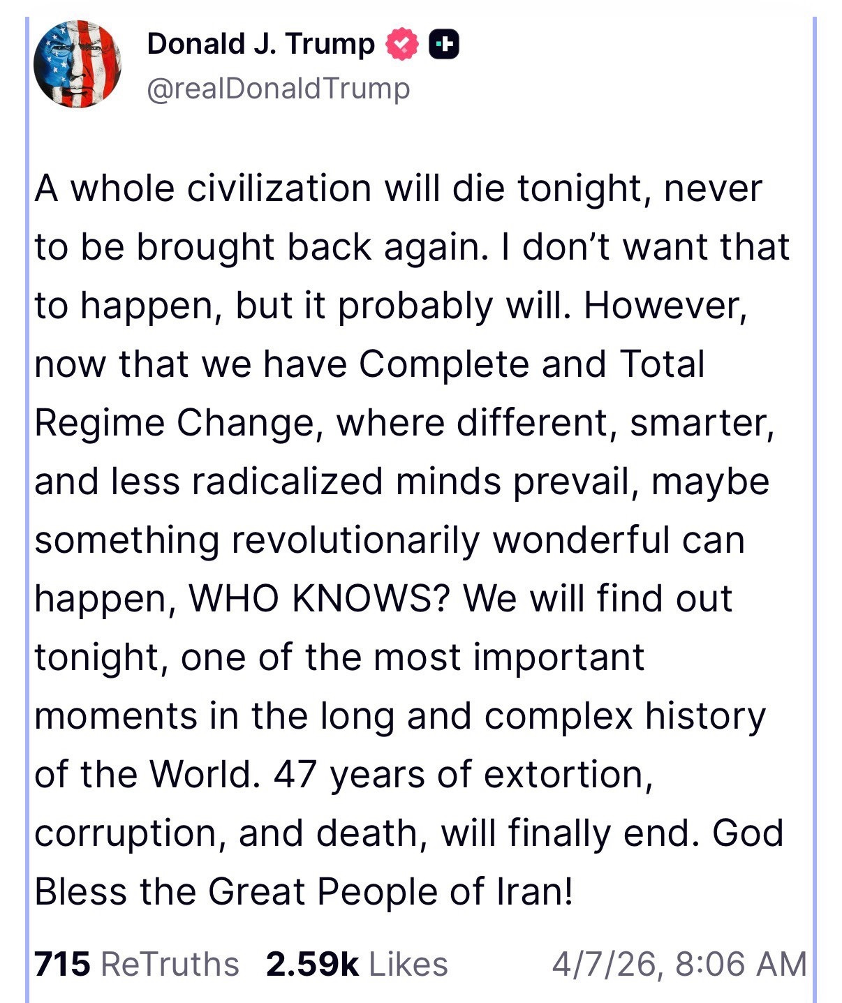 Later that evening, after a beautiful visit and dinner with dear friends, I sat down at home to unwind and opened social media for the first time that day. One of the first things that filled my screen were the words of our president, spewing hatred, blasphemy, and profanity alongside threats that Iran would be “living in hell” on Tuesday.